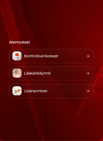 Sukuhormonit: Estradioli (S -E2) Follikkelia stimuloiva hormoni (S -FSH) Luteinisoiva hormoni (S -LH) Progesteroni (S -PROG) Sukupuolihormoneja sitova globuliini (S-SHBG) Testosteroni (S-Testo) Vapaa testosteroni (S-TestoVL) Kilpirauhanen: Parathormoni (fP-PTH) Tyreoperoksidaasivasta-aineet (S-TPOAb) TSH (S-TSH) Tyroksiini vapaa (S-T4-V) Triiodityroniini Vapaa T3-hormoni (S-T3-V) Tulehdus: CRP herkkä (S-CRP herkkä) Sydän ja verisuonet: Kokonaiskolesteroli / HDL (TC/HDL) LDL / Apolipoproteiini B LDL / HDL Triglyseridit / Apolipoproteiini B Triglyseridit / Kokonaiskolesteroli (TG/TC) Non-HDL-kolesteroli Apolipoproteiini B (fS-LipoB) HDL-kolesteroli (fS-Kol-HDL) Homokysteiini (P-Hcyst) Kokonaiskolesteroli (fS-Kol) LDL-kolesteroli (fS-Kol-LDL) Lipoproteiini (a) Lp(a) fS-Lipo (a) Triglyseridit (fS-Trigly) Rauta-arvot: Raudan sitomiskyky (TIBC) Ferritiini (S-Ferrit) Transferriini (fS-Transf) Metabolia: HOMA-IR Paastoglukoosi (fP-Gluk) HbA1c (B-HbA1c) Insuliini paasto (fS-Insu) Uraatti (S-Uraat) Stressi ja lisämunuainen: DHEA (S-DHEA) Biologinen ikä: (PhenoAge) Munuaiset: eGFR (Pt-GFRe) Glomerulusten suodatusnopeus Kreatiniini (S-Krea) Maksa: ALAT (S-ALAT) Albumiini (S-Alb) ASAT (S-ASAT) Alkalinen fosfataasi (S-AFOS) ASAT / Alaniiniaminotransferaasi (ALAT) Bilirubiini (S-Bil) GT (S-GT) Glutamyylitransferaasi Vitaminit ja ravinteet: Aktiivi B12 (S-B12-TC2) Folaatti (fS-Folaat) B9-vitamiini D-vitamiini 25-OH (S-D-25) Hematologia: Eosinofiilit (B-Eos) Eosinofiilit % (L-Eos%) Erytrosyytit (B-Eryt) Hemoglobiini (B-Hb) Hematokriitti (B-HKR) Lymfosyytit (B-Ly) Lymfosyytit % (L-Ly%) Monosyytit (B-Monos) Monosyytit % (L-Monos%) Neutrofiilit (B-Neut) Neutrofiilit % (L-Neut%) Trombosyytit (B-Trom) Basofiilit (B-Baso) Basofiilit % (L-Baso%) Leukosyytit (B-Leuk) MCH (E-MCH) MCHC (E-MCHC) MCV (E-MCV) RDW (E-RDW) Kivennäisaineet: Fosfaatti (fS-Pi) Kalium (P-K) Kalsium (S-Ca) Kalsium albumiinikorjattu (P-Ca-albk) Natrium (S-Na) Sinkki (S-Zn)